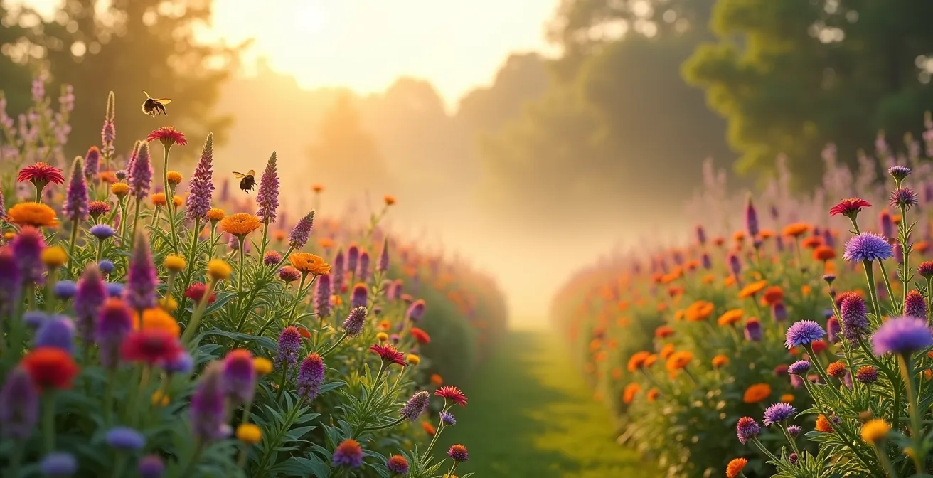 Le lien avec les pollinisateurs est direct et implacable. Des plantes qui poussent dans un sol pauvre et dégradé sont des plantes stressées. Elles produisent moins de fleurs, et surtout, un nectar de piètre qualité, moins concentré en sucres et en acides aminés. Pour une abeille, butiner une fleur issue d’un sol mort équivaut à boire de l’eau sucrée bas de gamme : l’énergie dépensée pour la récolte est à peine compensée par la valeur nutritive. À l’inverse, un sol riche et vivant, structuré par les vers de terre, produit des plantes vigoureuses dont le nectar est un véritable concentré d’énergie.