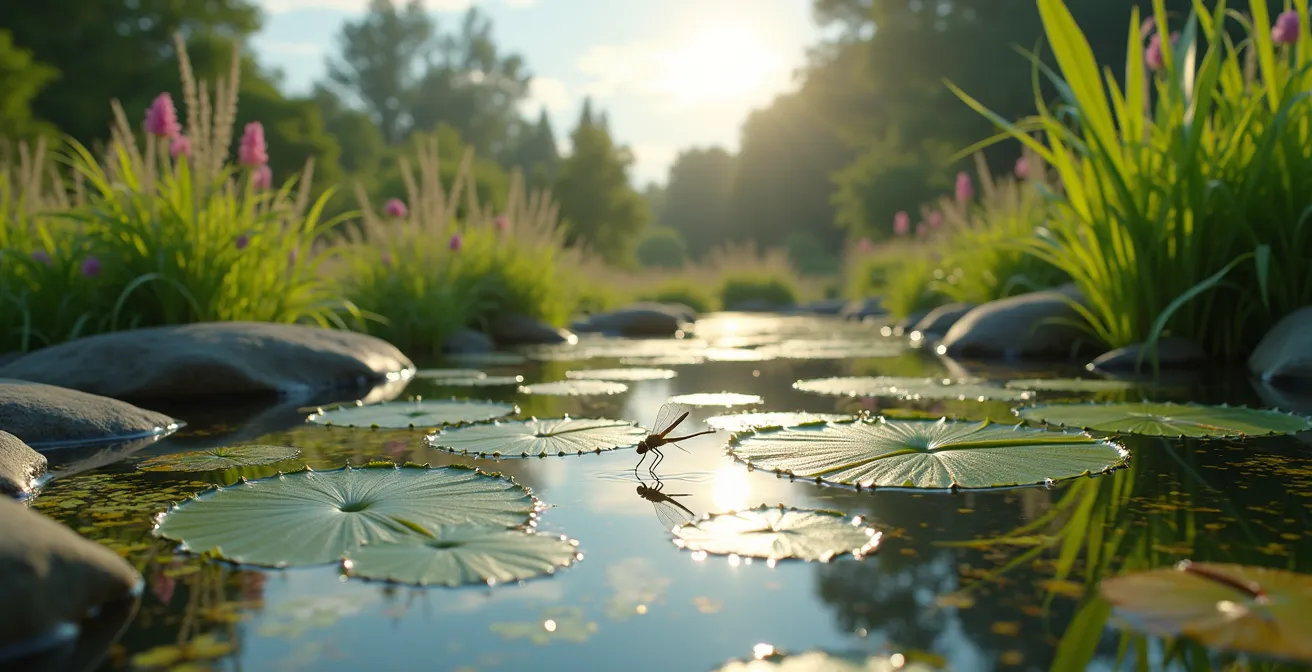 - Une mare équilibrée élimine naturellement les moustiques grâce à un écosystème de prédateurs (libellules, grenouilles) qui n’existe pas dans l’eau stagnante.